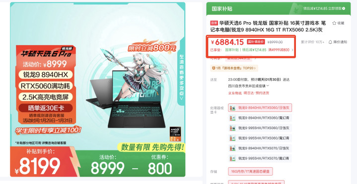 而在众多2025年款笔记本中,华硕天选6 Pro锐龙版凭借真香售价和全能配置,成为了不少学生党的首选之一。首先在价格方面,近日天选6 Pro锐龙版迎来限时直降,立减300,叠加国补后,锐龙9 8940HX+RTX 5060版本到手价低至6884,直接击穿7000元大关。这个配置、这个价格,在存储涨价的背景下,显得尤为珍贵。